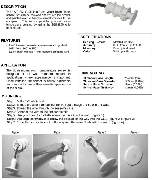This Flush Mount 1-wire temperature sensor can be screwed directly into the drywall and painted over to become almost invisible to the occupant.